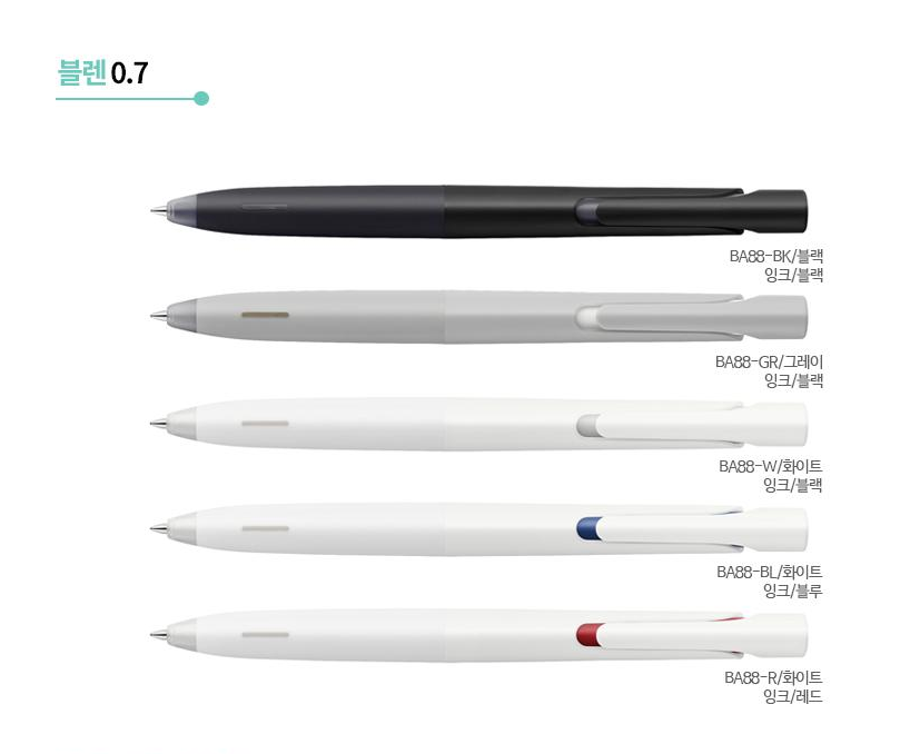 또한 0.7mm의 적당한 굵기는 사무용 문서, 필기, 서명 등 다양한 용도에 적합하며, 번짐 없이 선명한 글씨체를 구현합니다. 제브라 블렌의 외형은 군더더기 없이 깔끔한 실루엣으로, 블랙·화이트·네이비 등 다양한 컬러 옵션이 제공되어 기업의 이미지에 맞게 선택이 가능합니다.